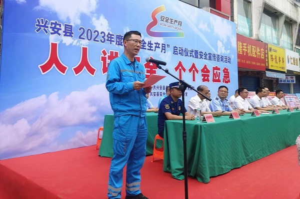 “為認真履行企業主要負責人第一責任人責任,我承諾:全面落實安全生產法規定職責,帶頭研究組織本企業重大事故隱患排查整治、帶頭落實全員安全生產崗位責任,發揮管理團隊和專家作用……堅決防范遏制各類生產安全事故發生。”6月16日,廣西興安縣安全宣傳咨詢活動現場,興安海螺公司總經理任文皓作為全縣企業代表,作出鄭重承諾。