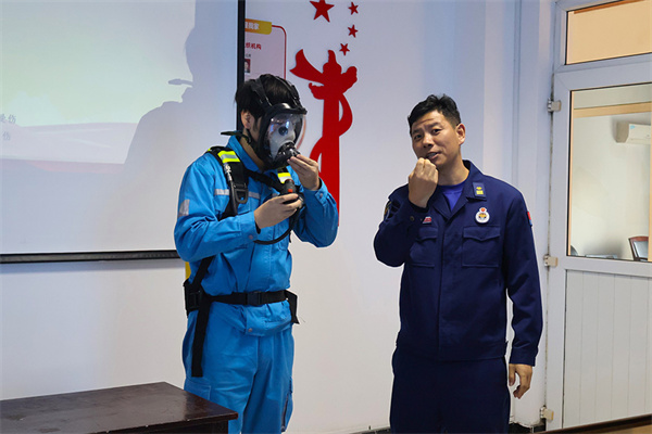 安徽蕪湖,海螺水泥部室員工認真參與火災事故應急演練,鏡湖區消防救援大隊的消防員現場向大家講解過濾式自救呼吸器、緩降器、消火栓等應急器材的使用方法。
