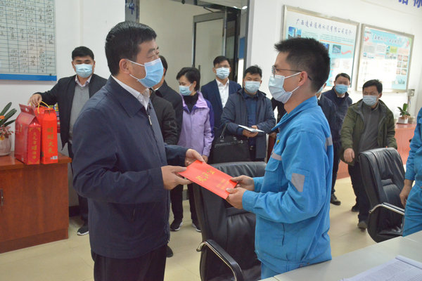 最后,方副主席向凌云通鴻公司春節期間堅守崗位的員工代表送上慰問金和慰問禮包。