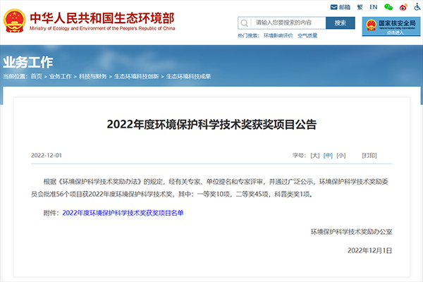 ●《大氣污染物與溫室氣體協同控制政策和技術示范研究》獲評2022年度環境保護科學技術獎二等獎