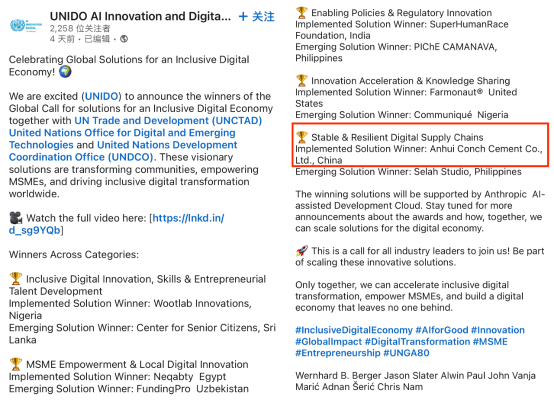 近日,海螺集團下屬“安徽海螺水泥股份有限公司——海螺云工大模型”在聯合國工業發展組織等機構于2025年7月發起的“2025包容性數字經濟全球解決方案征集”中,榮獲: 穩定與韌性的數字供應鏈 類別 最佳實施方案獎 獎項。