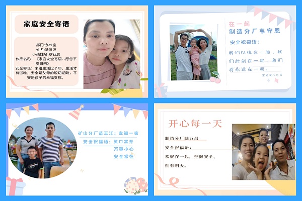 “我們以往在一起,我們此刻在一起,我們將永遠在一起。”“歡聚在一起,把握安全,擁有明天”......安全親情文化墻上,溫情滿滿,一張張與父母、愛人和子女的合影,一條條發自內心的祝福語,見證著家人無盡的牽掛,承載著一個又一個家庭對平安幸福的向往。“沒有什么比一家人幸福團圓更重要,正如安全誓詞所說的,我是父母的牽掛,我是家庭的脊梁,我是企業的基石。我將把親人的囑托記在心間,高高興興上班來,平平安安回家去,不讓家里人為我擔心。”隆安海螺藍玉江說。