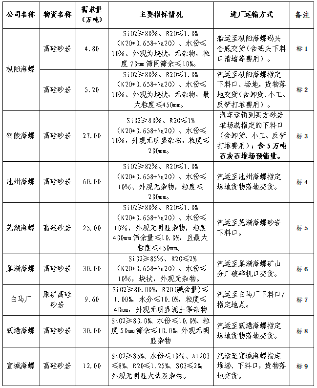 根據生產需求,本著“公開、公平、公正”的原則,擬對省內和皖北區域部分子公司(白馬山水泥廠、蕪湖海螺、荻港海螺、銅陵海螺、池州海螺、樅陽海螺、宣城海螺和巢湖海螺)外購砂巖進行公開招標,歡迎具備條件的單位參加,現將招標相關事宜公告如下: