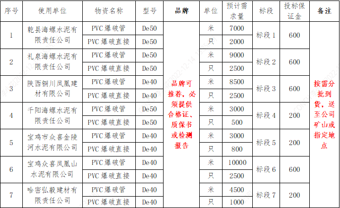 為進一步優化拓展供應渠道,降低采購成本,規范采購行為,充分發揮區域集中采購優勢,提高采購效率,本著公開、公平、公正、透明的原則,擬對陜甘區域2023年度PVC爆破管、PVC爆破直接進行聯合公開招標采購,擇優選擇供應商,現將招標基本信息發布如下: