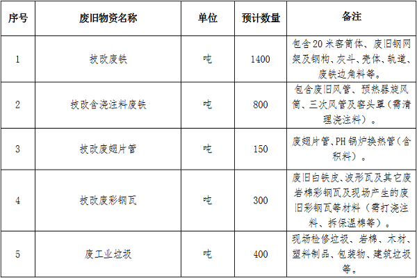 我公司計劃5月份實施1#窯綜合能效提升項目,為及時處置項目產生的廢舊物資,保障項目實施進度受控,同時積極拓寬出售渠道,提升招標效益,確保廢舊物資出售過程的公開、公平、公正,現擬開展本次廢舊物資招標出售工作,本次招標在海螺陽光智慧采購平臺進行公開招標(http://srm.chinaconch.com/oauth/),現將招標信息公示如下: