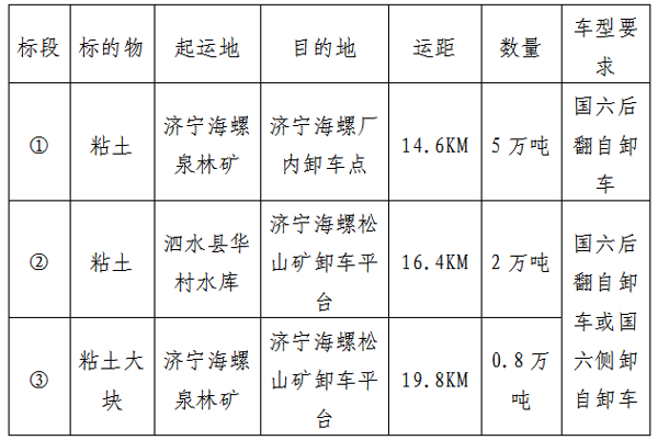 1.標的物:標段①、②粘土運輸;標段③粘土大塊運輸。