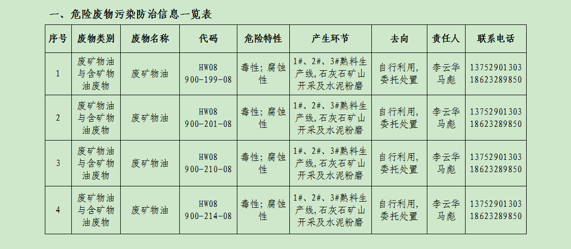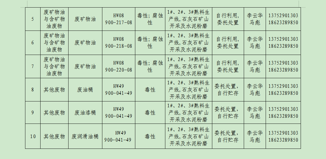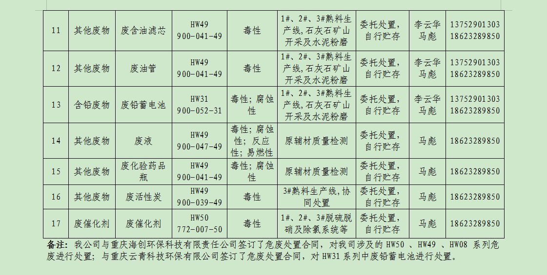 廢棄物的產(chǎn)生單位及管理:礦山分廠由俸云龍負(fù)責(zé)管理,負(fù)責(zé)督促員工把產(chǎn)生的危廢分類定期送危廢庫(kù)暫存,危廢庫(kù)由維修工段工段長(zhǎng)負(fù)責(zé),負(fù)責(zé)收集并記錄危廢臺(tái)賬;主廠區(qū)由易軍負(fù)責(zé)管理,負(fù)責(zé)督促員工把產(chǎn)生的廢分類定期送危廢庫(kù)暫存,危廢庫(kù)由環(huán)保主管馬彪負(fù)責(zé),負(fù)責(zé)收集并記錄危廢臺(tái)賬。危廢庫(kù)危廢定期聯(lián)系重慶海創(chuàng)環(huán)??萍加邢挢?zé)任公司、重慶云青環(huán)??萍加邢薰?/span>等有資質(zhì)公司回收處理并完善相應(yīng)危廢聯(lián)單。