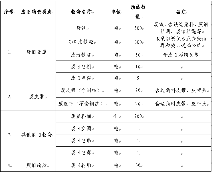 1.包含但不限于以上廢舊物資類別,同時(shí)數(shù)量?jī)H為預(yù)估數(shù)量,具體數(shù)量以實(shí)際過(guò)磅或點(diǎn)數(shù)回收數(shù)量為準(zhǔn)。