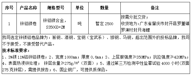 1、招標物資信息:宣城海螺建筑光伏公司2023年12月-2024年2月生產用鋅鎂鋁卷(根據項目結束時間)。