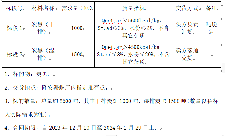 根據隆安海螺水泥有限責任公司生產需求,擬對生產用炭黑進行招標采購,為體現公平、公正、公開的原則,通過網上海螺陽光智慧采購平臺(網址:http://srm.chinaconch.com/)進行公開招標,現將招標相關事宜公告如下:
