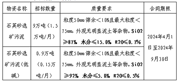 投標人在報價時應綜合考慮石英砂選礦污泥生產、運輸過程中一切不確定因素,以及我公司要求的硅含量、堿含量等質量指標,合理報價。合同期內價格固定不變。兩種質量石英砂選礦污泥分標段分別評標,按各標段最低價原則選擇中標單位。