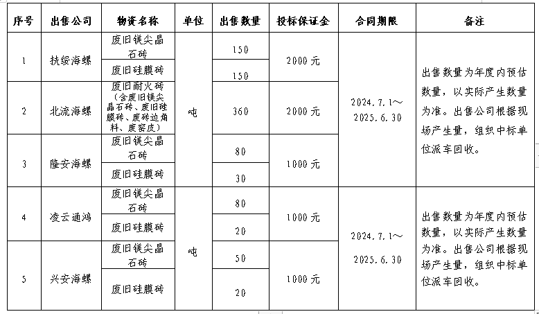 為規范區域內各公司自動插袋包裝機所用自動袋外包裝紙盒(簡稱:廢紙盒)、廢舊耐火磚出售管理,保證廢紙盒、廢舊耐火磚出售過程的公開、公平、公正,擬開展廣西區域2024-2025年度廢紙盒、廢舊耐火磚出售招標工作,現將招標信息公示如下: