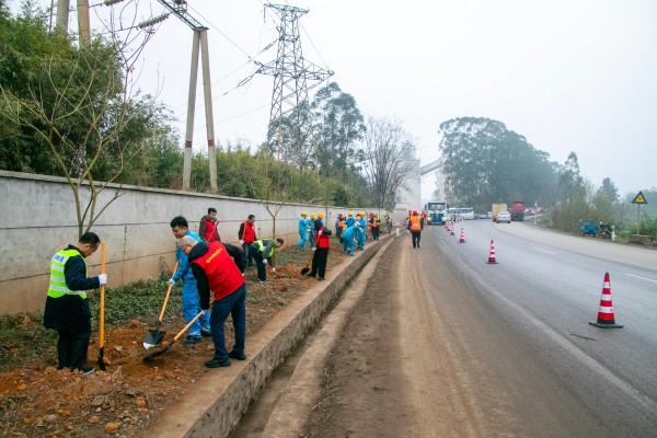 活動現場,扶綏海螺的20余名職工代表與桂西公路發展中心黨員干部、青年志愿者分工協作,揮鍬鏟土、扶苗培土、澆水定根,一派繁忙景象。經過數小時勞作,共種植紫花風鈴喬木50余株,綠化路段2.5公里,新栽樹苗整齊排列,與去年煥然一新的路面相映成輝,勾勒出“車在綠中行,人在景中游”的生態畫卷。