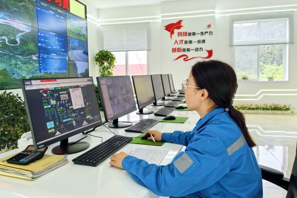 礦山分廠局控操作員李良瓊的視線在監控屏幕間快速流轉。她左手同步更新生產數據臺賬,右手實時調節設備參數,數字化看板上的綠色運行曲線,見證著這位“工藝線守護者”護航設備高效運轉的智慧。(胡萬禹/攝)