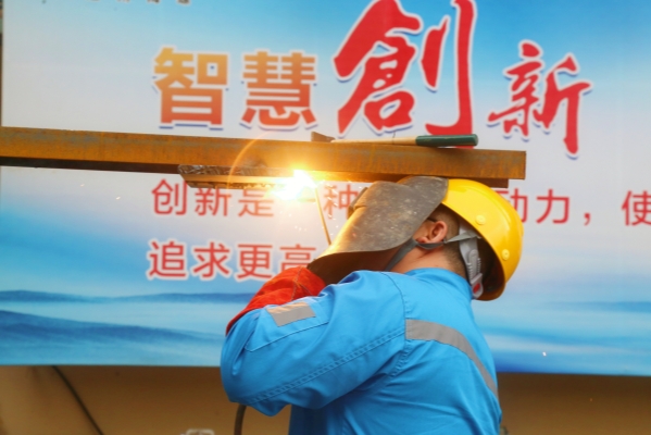 同一賽場上,制造分廠機械維修工馮雙正在馬不停蹄地進行手工焊接,飛濺的焊花與“智能創新”的標語交相輝映。(陳龍/攝)