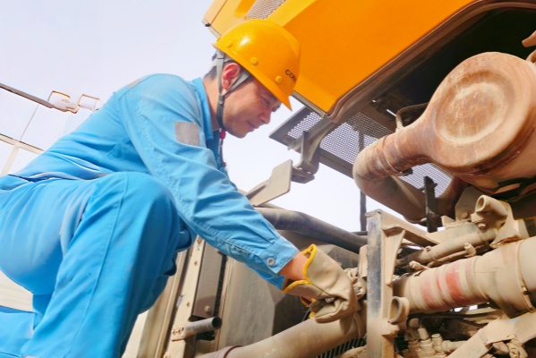 水泥分廠裝載機班長黃尤紅正在對裝載機進行360度巡檢,確保車輛性能完好,為水泥生產原材料輸送效率提供可靠的保障。(楊雪峰/攝)
