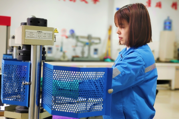 生產品質處物檢組長仁桃正在進行水泥膠砂強度破型,她說道:“破掉的是試塊,撐起的是達州海螺水泥質量的口碑。”(沈雪蓮/攝)
