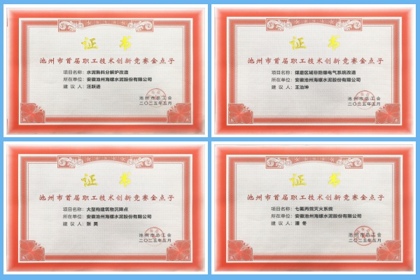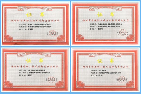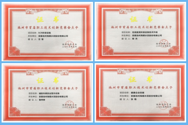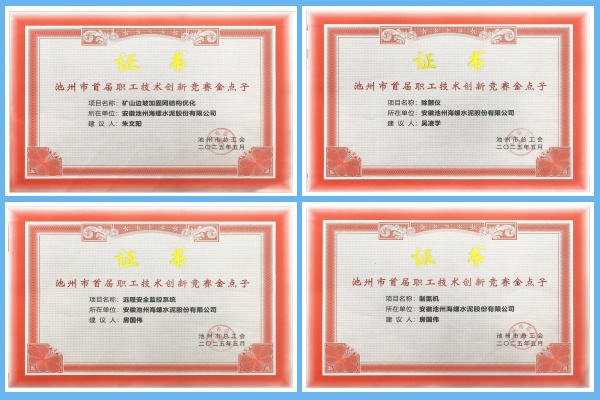 2025年11月,池州海螺榮獲池州市總工會(huì)頒發(fā)的多項(xiàng)證書嘉獎(jiǎng),以表彰其在池州市首屆職工技術(shù)創(chuàng)新競賽中所取得的優(yōu)異成績。